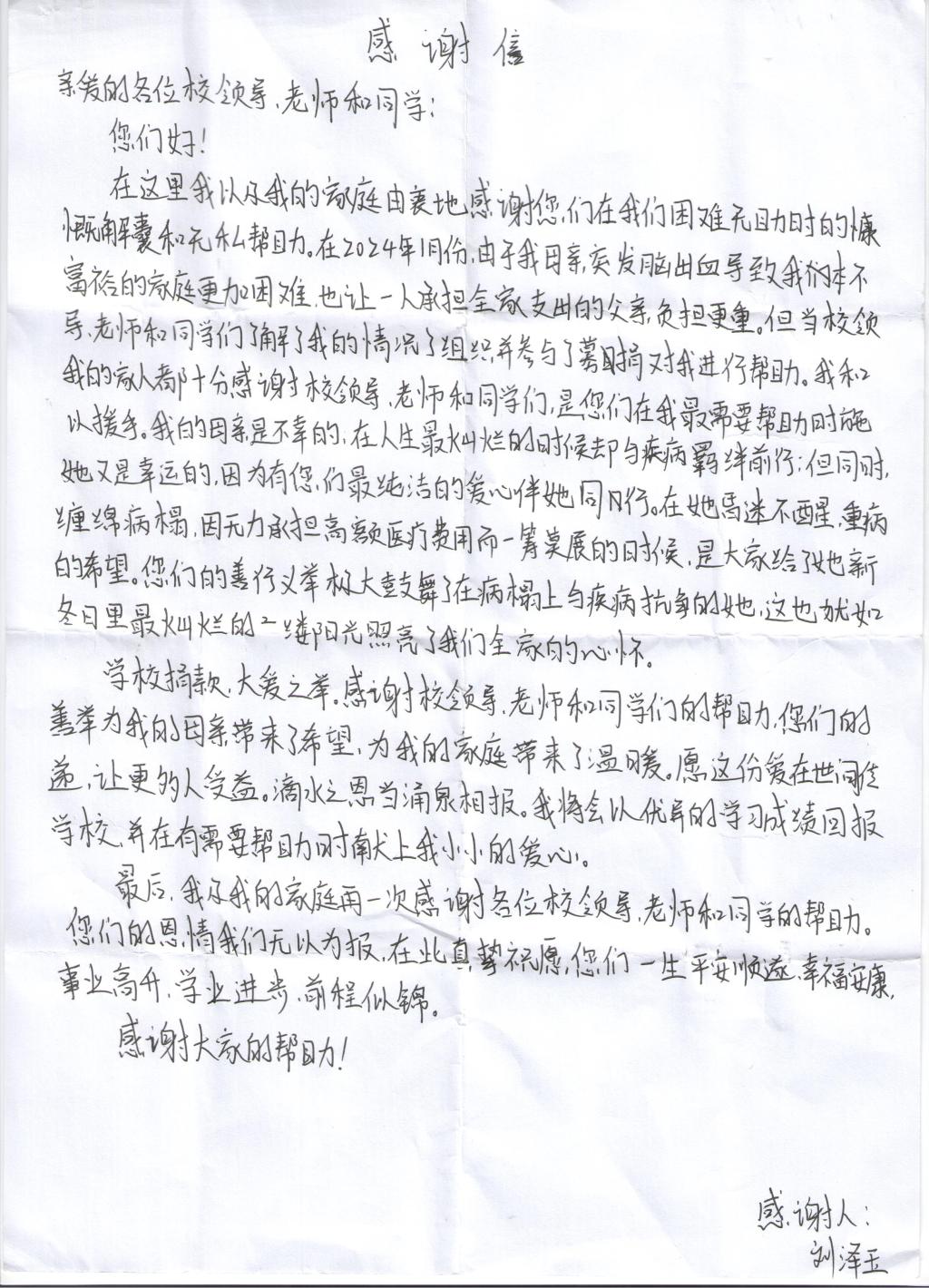 2024年3月5日,9001cc金沙2022級劉澤玉同學(xué)為感謝全校領(lǐng)導、老師和同學(xué)的幫助送來(lái)了一封感謝信。感謝我校師生在她的母親遭受疾病、全家手足無(wú)措的時(shí)候伸出援手,雪中送炭,為她的家庭帶來(lái)了溫暖,她希望這份愛(ài)意能繼續傳遞。同時(shí)以這樣的形式來(lái)表達自己的感激之情。